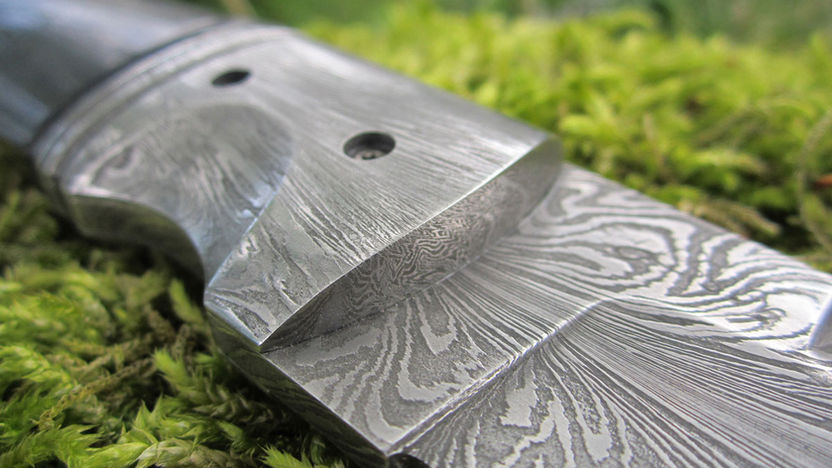 Klingen er slebet i kulstof-damask og bærer det karakteristiske mønster fra den lagdelte smedeteknik. Kulstofstålet har en høj skæreevne og holdbarhed, men er ikke rustfrit og kræver derfor lidt vedligeholdelse – til gengæld udvikler det med tiden en smuk og personlig patina.