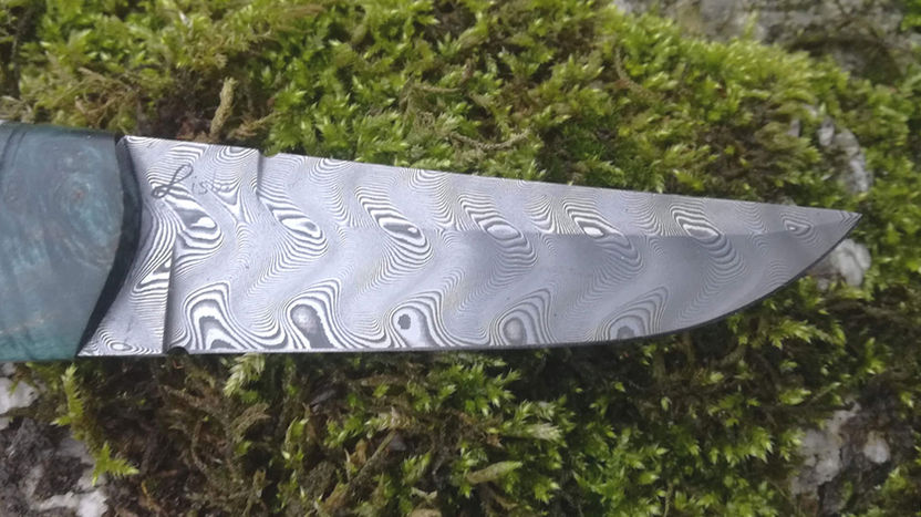 Klingan är tillverkad i damaskerat stål från Balbach och smidd med det karakteristiska Herringbone-mönstret. Det markanta mönstret i stålet vittnar om det noggranna smidet och ger klingan ett levande uttryck. Stålet är inte rostfritt och kräver därför regelbundet underhåll, men belönar användaren med hög eggstyrka, personlig patina och lång livslängd.