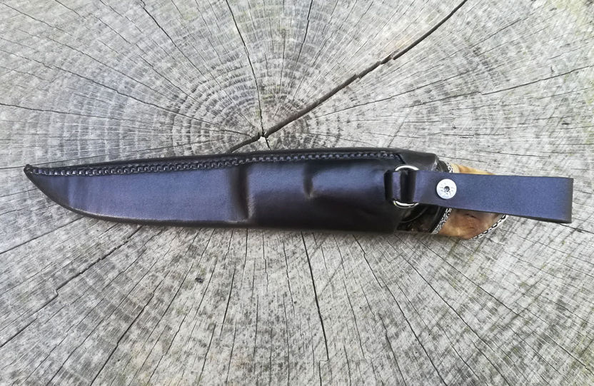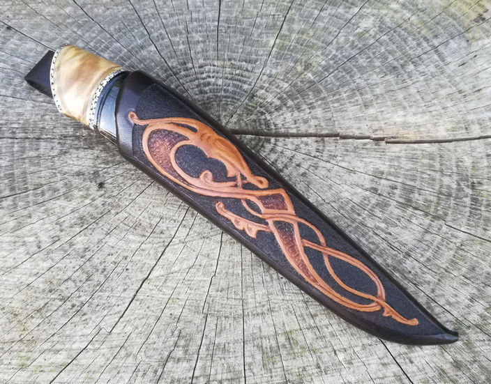 Slidan är tillverkad av färgat, hårdpressat läder och dekorerad med skuret och präglat mönster i nordisk vikingastil. Knäppningen är gjord i stabiliserad poppelknut, vilket skapar visuell samhörighet med fästet och fulländar det sammanhållna uttrycket.