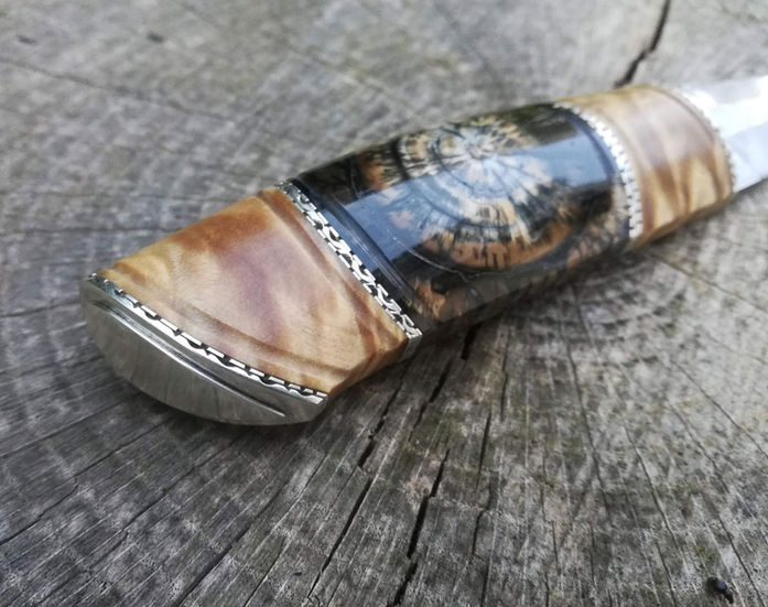 Denna kniv är utförd med stor respekt för material, detaljer och traditionellt hantverk. Fästet är sammansatt av stabiliserad mammutbet och stabiliserad poppelknut, två material med varsin naturlig struktur och färgspel. De filade inläggen i silver skapar en elegant och precis övergång mellan elementen, medan både fram- och ändplatta i massivt silver understryker det exklusiva helhetsintrycket.