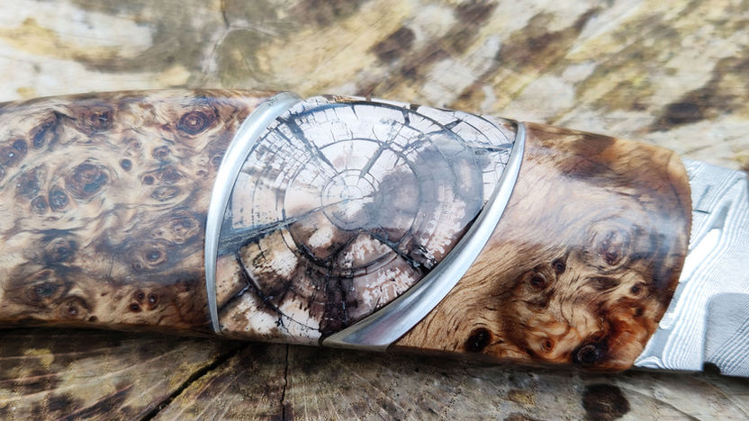 Knivens skaft är sammansatt av stabiliserad poppelknut och stabiliserad mammutbet – ett sällsynt och fossilt material med upp till 40 000 års historia. De två materialen binds samman av hålslipade, triangulära inlägg i tenn, som ger skaftet rytm och ett grafiskt uttryck. Kombinationen av levande trästruktur, elfenbensliknande bet och kall metall ger skaftet karaktär och balans.
