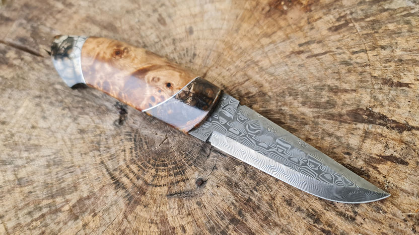 Bladet är smitt i damaskerat rostfritt stål från Balbach – DSC Inox – som förenar dekorativt mönster med slitstyrka. Bladet är härdat till 59–60 HRC, vilket ger en skarp och hållbar egg, lämplig för precist och krävande bruk.