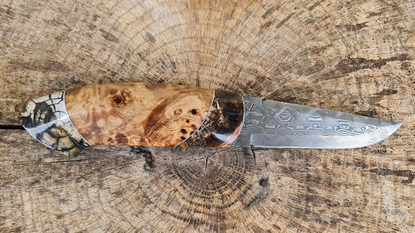 Knivens fäste är sammansatt av stabiliserad poppelknut med ett inlägg av stabiliserad mammutstödtand – ett sällsynt och fascinerande material, omkring 40 000 år gammalt. Träets och tandens naturliga strukturer och nyanser skapar ett levande och harmoniskt uttryck, förstärkt av ett elegant tininlägg. Fästet avslutas med en ändplatta i 925 sterlingsilver, vilket tillför både tyngd och en förfinad finish.